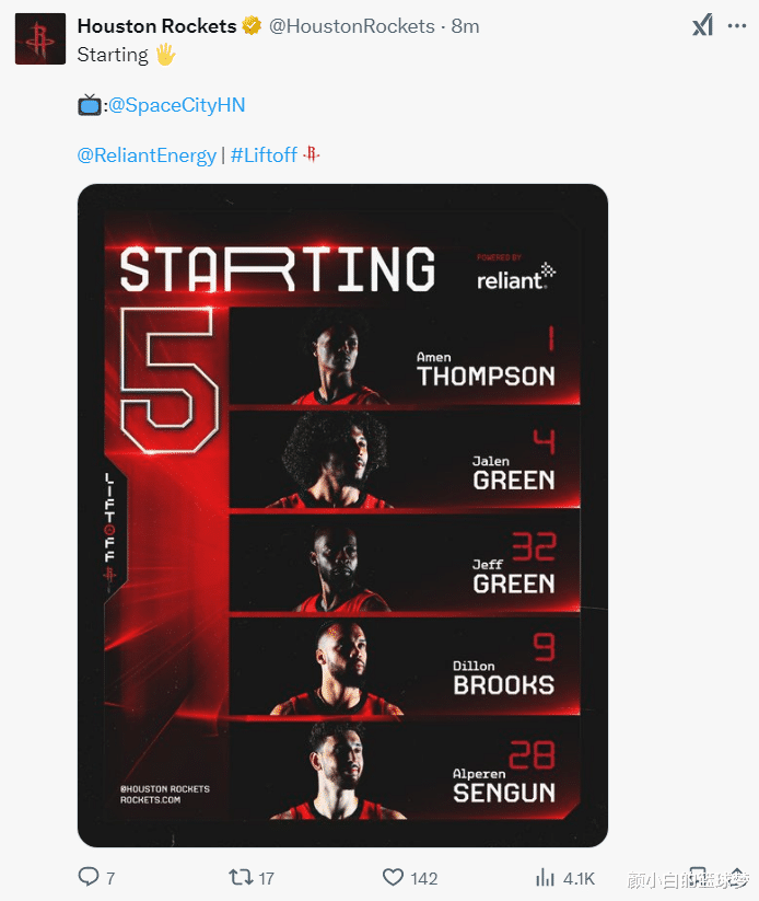火箭这边范弗利特因个东谈主原因缺席,阿门改打一号位,杰夫-格林打先发四号位。伊森复出有登场技巧适度。