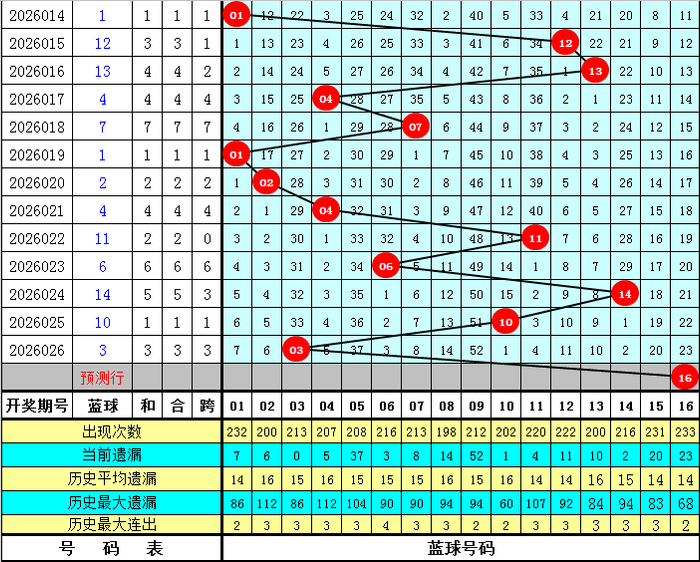 蓝球分析:前5期蓝球号码区别开出:11、06、14、10、03,其中偶数蓝球开出了3次,出现比例较高,本期预测蓝球再出偶数,参考蓝球号码16。